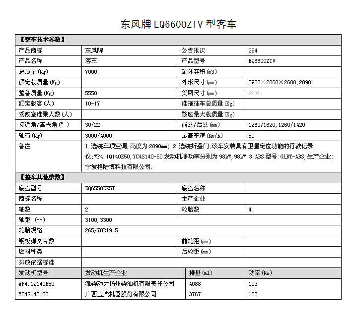 新聞中心EQ6600ZTV四驅(qū)越野客車圖片,國五排放四驅(qū)10座越野客車價格,6米四驅(qū)客車多少錢,東風四驅(qū)越野客車參數(shù)配置: 1.底盤型號EQ6550KZ5T,發(fā)動機型號:YC4S140 50 國五排放 2.整車外形尺寸長寬高:(5980×2060×2890)mm 驅(qū)動形式:4×4 東風分時四驅(qū) 3.離合助力,方向助力,斷氣剎,鼓式自動,駕駛區(qū)域空調(diào) 4.車橋為東風德納,輪胎為265/70R19.5型越野輪胎,ABS 5.工具箱,前置防裝杠,粘接式推拉玻璃,發(fā)動機底板防護 6.鋁花紋地板,中檔皮革座椅10個+1個折疊座椅,整車座椅安全帶,手動式外擺門,正副司機門,后置雙開門,東風原廠派恩頂置空調(diào) , 7.窗簾,滅火器兩個,備胎一個,獨立燃油暖風系統(tǒng)帶兩個雙面王出風口 8.其它為EQ6600ZTV型四驅(qū)越野客車標配。具體配置參數(shù)參照(附件一)。 成品合格證、全額上戶發(fā)票、隨車工具、隨車文件各一套。