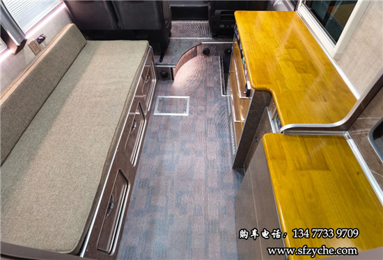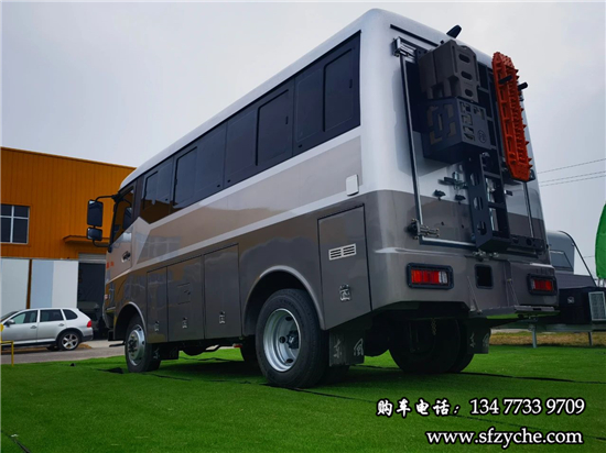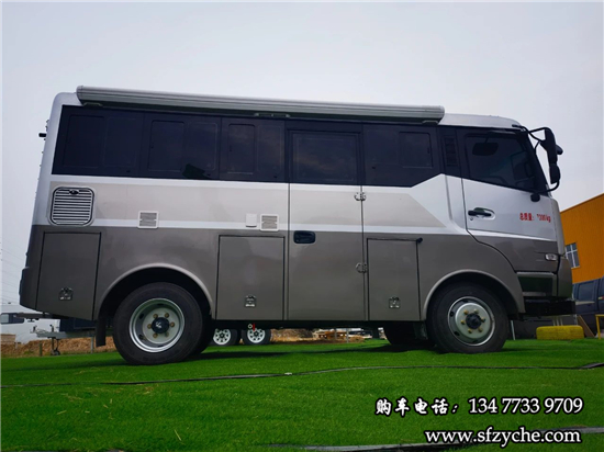 車身右側(cè)配備了4m的電動(dòng)遮陽(yáng)棚、市電接口、尾部工具箱、戶外照明燈,中置上客門,副駕駛乘客門,車輛門鎖均采用越野專用倉(cāng)門鎖。