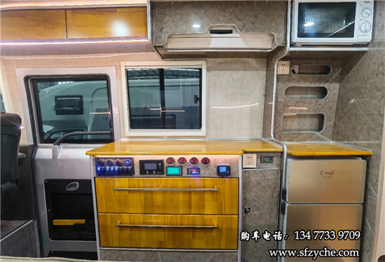 單人座椅后方是中置上客門,在后方是一體式櫥柜,下方帶有儲(chǔ)物抽屜,上方暗藏了一臺(tái)家用變頻空調(diào),乘客門上方也提供了多個(gè)儲(chǔ)物吊柜,儲(chǔ)物空間充足。櫥柜旁鑲嵌了一臺(tái)108L上下雙開(kāi)門的冰箱,上方則是一臺(tái)微波爐,側(cè)面的壁板上還帶有電源插座。