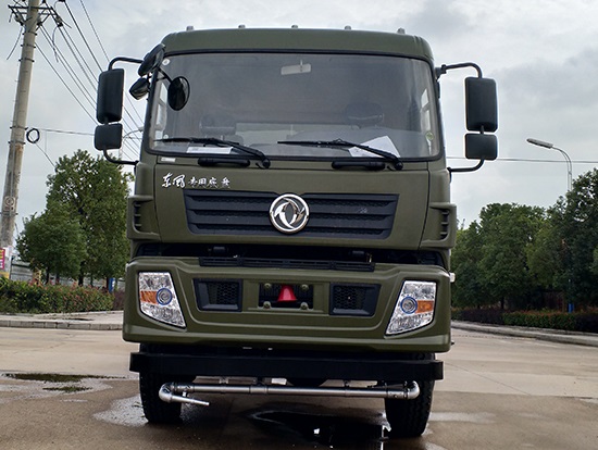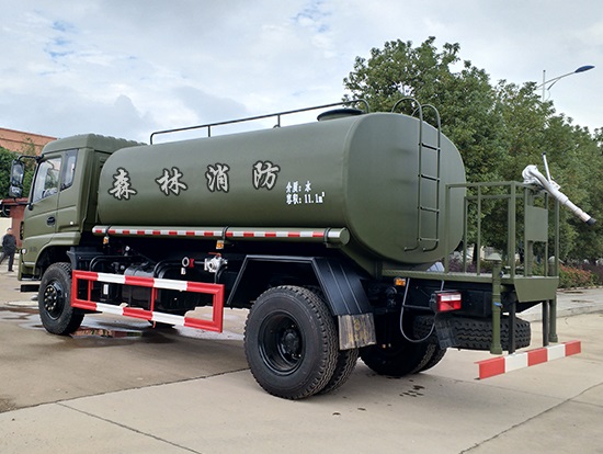 采用東風(fēng)EQ2180GD5DJ型越野汽車底盤,東風(fēng)一排半寬體駕駛室,4×4驅(qū)動(dòng),康明斯ISB190 50國(guó)五發(fā)動(dòng)機(jī),六檔變速箱,東風(fēng)商用車橋,前驅(qū)動(dòng)橋3.8噸,后橋10噸,10.00R20輪胎,軸距4500mm,電動(dòng)玻璃,方向助力,斷氣剎,ABS。罐體采用優(yōu)質(zhì)碳鋼QB235板材,板材厚度4mm,罐體容積11.1立方,變速箱安裝取力器,大功率水泵可泵進(jìn)泵出,后置工作平臺(tái)帶水炮射程25米,消防栓接口左右各一個(gè),選裝駕駛室頂部安裝長(zhǎng)條警燈帶喊話器,全車顏色軍綠,兩側(cè)噴涂白色森林消防字樣。