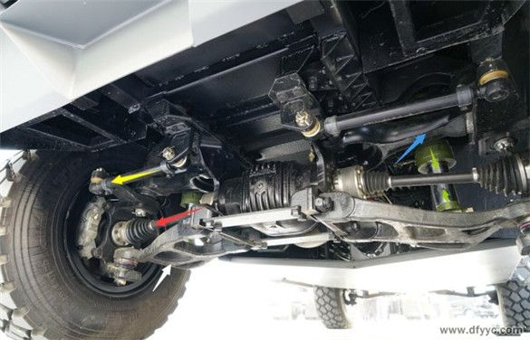 東風(fēng)四驅(qū)裝甲防雷反恐戰(zhàn)車為前置動力、實(shí)時(shí)四輪驅(qū)動設(shè)定,縱置發(fā)動機(jī)(白色箭頭)直接與變速器(綠色箭頭)剛性連接,通過中間傳動軸(黃色箭頭)至分動器,在經(jīng)過前傳動軸(紅色箭頭)與后傳動軸將動力輸出至前后驅(qū)動橋。