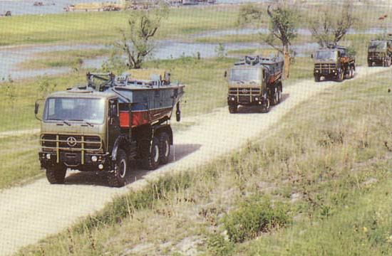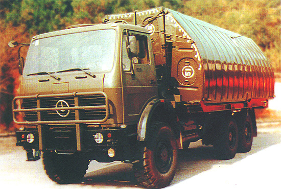 鐵馬XC2200重載卡車(chē)在1980年后期進(jìn)入PLA服役,主要用于運(yùn)輸重型工程設(shè)備和武器系統(tǒng)。中國(guó)鐵馬(Tiema) XC2200重載卡車(chē)由西南汽車(chē)廠(現(xiàn)在北方- 奔馳卡車(chē)公司分部)制造,位于重慶(Chongqing)市。卡車(chē)以德國(guó)梅賽德斯-奔馳2060型卡車(chē)為基礎(chǔ)。目前卡車(chē)在PLA服役中,被當(dāng)做重型工程設(shè)備卡車(chē)和武器系統(tǒng)車(chē)底盤(pán)。PLA在1970年后期訂購(gòu)了少量的德國(guó)梅賽德斯-奔馳2026型重載卡車(chē)(8噸的容量,6X6)補(bǔ)充它不足的重載卡車(chē)。這些卡車(chē)主要地用于重型火炮拖車(chē)任務(wù)。PLA對(duì)車(chē)輛的性能印象深刻,并且接洽梅賽德斯- 奔馳公司去得到許可在中國(guó)聯(lián)合生產(chǎn)卡車(chē)。鐵馬XC2200(最初即是TM-SC2030)的發(fā)展,梅賽德斯- 奔馳2060型的一個(gè)中國(guó)仿造型,從1980年早期開(kāi)始。 西南汽車(chē)廠,一個(gè)中國(guó)北方工業(yè)總公司(NORINCO)位于重慶(Chongqing)市的下屬公司,被選擇當(dāng)做主承包商。1982年看到了原型的介紹。稍后在1985年中國(guó)從西德引進(jìn)了ZF機(jī)械變速箱和KHD413風(fēng)冷柴油發(fā)動(dòng)機(jī)技術(shù),兩者在鐵馬XC2200卡車(chē)上被采用。XC2200批量生產(chǎn)在1986年開(kāi)始,每年從生產(chǎn)線上生產(chǎn)2,000輛。大多數(shù)的這些車(chē)輛被PLA接收用于重貨物/設(shè)備運(yùn)輸、火炮拖車(chē)和武器系統(tǒng)車(chē)底盤(pán)。車(chē)輛包括在西藏高地、戈壁沙漠和中國(guó)最?lèi)毫拥牡缆泛吞鞖鉅顩r區(qū)域展示了優(yōu)良性能和可靠性。除了被PLA部署,車(chē)輛也被輸出到巴基斯坦、泰國(guó)、印尼和斯里蘭卡。XC2200采用雙車(chē)門(mén)正向控制駕駛室,位于發(fā)動(dòng)機(jī)艙上面。駕駛室有四個(gè)座位和在頂板有一個(gè)天窗。后面的貨物車(chē)身的后擋板和側(cè)擋板可放下,可拆卸蓬架和帆布蓬。單預(yù)備輪被垂直地安裝在乘員室后面,靠近載貨車(chē)箱在駕駛室和后貨物車(chē)體之間。這一個(gè)空間能用來(lái)容納一個(gè)修理工具箱和其它的裝載/卸貨設(shè)備。與第一代中國(guó)自行生產(chǎn)的重型臺(tái)車(chē)相比較,XC2200有好很多的通用性能,連同85公里/小時(shí)的最大道路速度和一個(gè)8噸的越野裝載能力。ZF5S-110/111 GPA變速箱有九個(gè)前進(jìn)檔和一個(gè)倒車(chē)檔。三個(gè)車(chē)軸和六個(gè)車(chē)輪全部運(yùn)行使用速度差速器鎖定裝置,即使當(dāng)車(chē)輛的一側(cè)上一個(gè)或更多的車(chē)輪沒(méi)有與地面接觸中,或已經(jīng)失去牽引,確保車(chē)輛持續(xù)驅(qū)動(dòng)。除了基本的貨物卡車(chē)改型之外,XC2200也可得到許多其它的改型, 包括4X4、8X8、長(zhǎng)軸距貨車(chē)、起重機(jī)、掩護(hù)所、架橋車(chē)、運(yùn)船車(chē)、道路鋪設(shè)車(chē)和多種武器系統(tǒng)車(chē)底盤(pán)。中國(guó)也已經(jīng)發(fā)展基于XC2200設(shè)計(jì)的WZ551輪式裝甲人員輸送車(chē)(APC)。鐵馬XC2200浮橋架橋卡車(chē)。鐵馬XC2200用于WS-1多管火箭發(fā)射裝置車(chē)底盤(pán)。鐵馬XC2200用于運(yùn)船車(chē)。