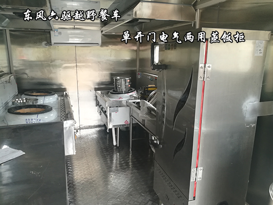 東風六驅越野餐車車輛概述:采用東風國五越野底盤改裝, 車廂材質采用外冷軋鋼板,內飾不銹鋼,中間保溫層,隱藏式上車踏步,頂部安全窗,兩個副食灶,一個蒸飯車,抽油煙機,平冷柜,水路,電路,油路等。