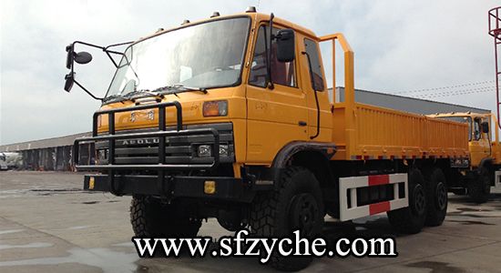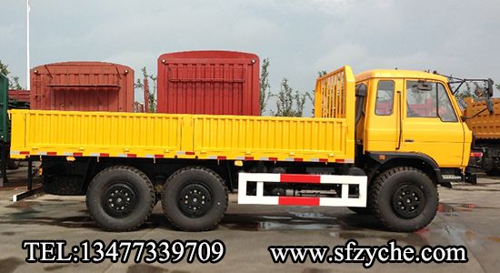 2、詳細(xì)配置:平頭一排半駕駛室,6*6驅(qū)動(dòng),康明斯190馬力,韶齒6檔變速箱,斷氣彈簧制動(dòng),貫通式中后驅(qū)動(dòng)橋,12.5R20越野胎,軸距 3500+1250mm,加厚雙層大梁,貨箱4850mm,帶軍用保險(xiǎn)杠。(新款仿天錦駕駛室加價(jià)1.5萬(wàn)元)東風(fēng)越野卡車:m.kcheer.com