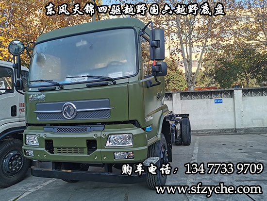 DFV2163GP6DJ型國六排放東風天錦四驅越野底盤,東風天錦D530一排半駕駛室,4×4驅動,康明斯B6.2NS6B210國六發(fā)動機210馬力,最大扭矩:850N.m/1100-1700rpm,排量6.2L、韶齒手動六檔變速箱,東風德納車橋,前驅動橋4.5噸,后橋10噸,10.00R20輪胎,軸距4500mm/4700mm,電動玻璃,方向助力,斷氣剎,ABS,大燈自動調節(jié),自動調整臂,選裝原廠空調。